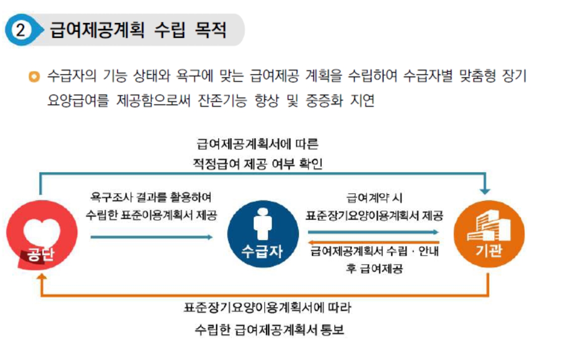 서비스 제공 계획을 수립할 때는 국민건강보험공단이 작성한 표준장기요양이용계획서를 바탕으로 한다.